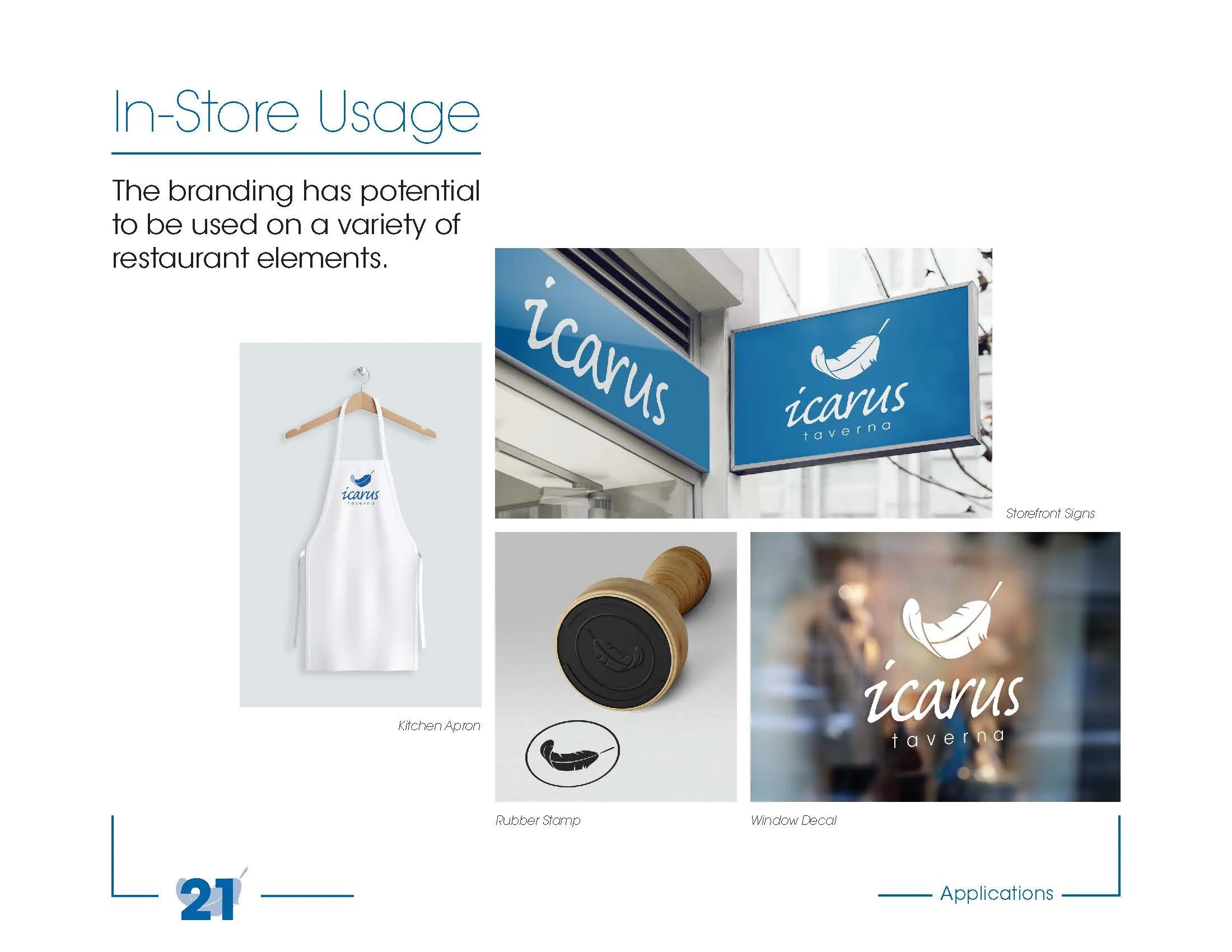 The brand identity uses two colours of blue. Depending on the application, it can be displayed in the darker or the lighter colour. In the perfect arrangement, the feather features both colours while the main title is written in black with a dark blue line underneath. The shades of blue are reminiscent of the classic blue and white colours familiar to Greek restaurants and the culture as a whole. While it would be sensible to completely eschew the traditional colours, it is advisable to keep some classic clichés in place to reinforce the ethnic style of the restaurant. There are probably a large number of people who do not know the connection between the mythological Icarus and the image of a feather. The blue and white contrast subtly restates the notion of Greek culture.